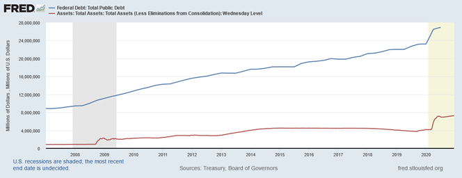 The story of the year was definitely Bitcoin. The futures exploded after stumbling initially on the pandemic in the early part of the year. There are two interpretations one might make of this blistering performance. On the positive, we might say that crypto’s time has come. People are moving toward decentralization and dissolution of control. However, if we add the plot of the public debt and the FED’s balance sheet size we see: