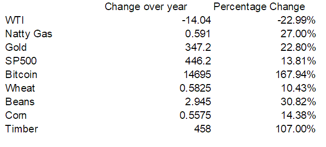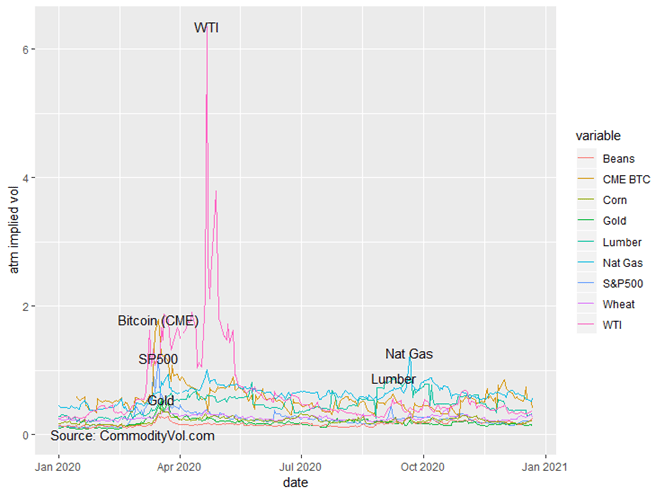 With the notable exception of WTI, we see healthy increases in the futures values for all commodities. While the broader equity market as reflected by the S&P 500 was up 14%, the real action was in timber, beans or natural gas. Implied volatility, on the other hand tells a very different story.