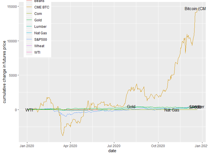 We present only three charts to summarize what happened and offer a glimpse as to what the new year might bring. First is a roundup of the front month futures price.